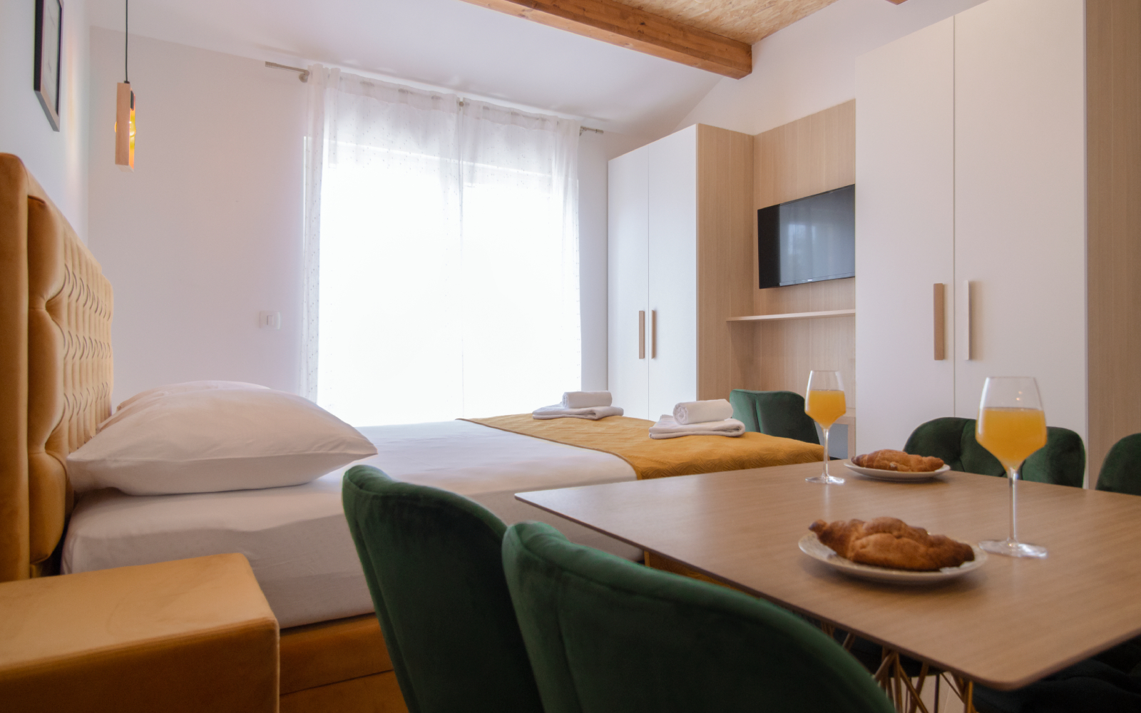 This studio boasts elegant decor, AC, a fully equipped kitchenette, and a furnished balcony with seating.